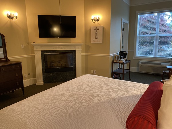 The Cathedral Fireplace KING sleeps 2 with a King bed, cozy gas fireplace, 50 inch flatscreen Smart TV with streaming capabilities, wi-fi, ceiling fan, step in shower, heat and air conditioning. Your room includes our complimentary amenity of specialty coffees and espresso, served with a light morning breakfast.