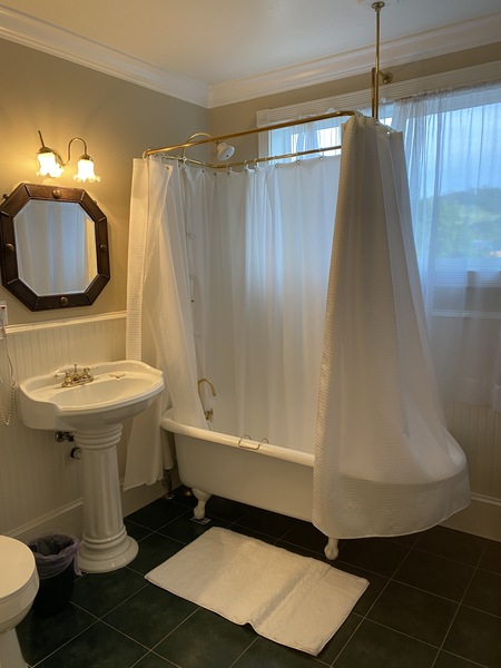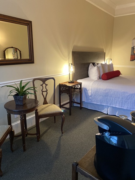 The Carriage House Suite is a 500 sq ft suite that sleeps 2 ( please note it is located up 2 sets of stairs ) with a King bed, cozy gas fireplace, 50 inch flat screen Smart TV with streaming capabilities, wi-fi, ceiling fan, step in shower with dual heads, private commode, double sinks, heated floor and Jacuzzi Tub for two. Private patio, central heat and air conditioning. Your room includes our complimentary amenity of specialty coffees and espresso, served with a light morning breakfasts.